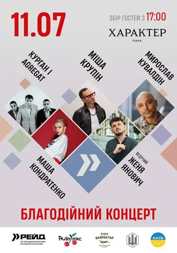 концерт БЛАГОДІЙНИЙ КОНЦЕРТ. Міша Крупін, Курган & AGREGAT, Маша Кондратенко, Женя Янович, Мирослав Кувалдін Київ 2025-07-11 18:00 ХАРАКТЕР park