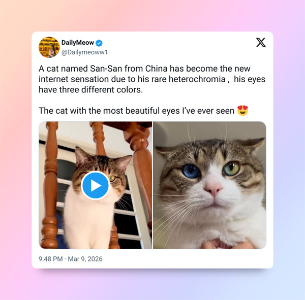Сан-Сан став помітним героєм соцмереж не просто через милий вигляд, а завдяки рідкісній особливості очей — у нього секторна гетерохромія, через яку в одному оці поєднуються одразу кілька відтінків. Таке стан пов’язане з розподілом меланіну і зазвичай не заважає зору або звичайному життю. Саме ця незвичайна деталь і зробила кота з Китаю об’єктом захоплення та уваги в інтернеті.