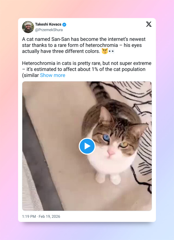 Кіт на ім’я Сан-Сан несподівано став новою зіркою інтернету. Спочатку здається, що в ньому немає нічого незвичайного, але варто придивитися уважніше — і одразу видно, що його очі забарвлені одразу в три кольори.