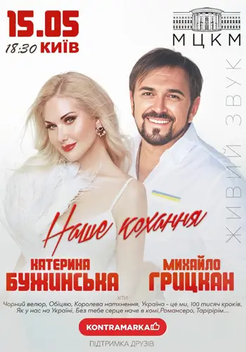 Концерт «Наша любовь» — это совместное выступление народной артистки Украины Екатерины Бужинской и заслуженного артиста Украины Михаила Грицкана, которое состоится 15 мая 2025 в 18:30 в Международном центре культуры и искусств (МЦКМ) «Октябрьский дворец» в Киеве.